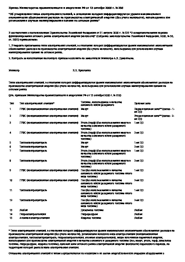 Приказ 256: Об утверждении типов электрических станций, в отношении которых дифференцируются уровни максимальных экономически обоснованных