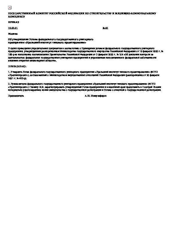 • Просмотр в полноэкранном режиме - легко просмотреть документ Об утверждении Устава федерального государственного унитарного предприятия "Уральский институт типового проектирования" (без загрузки его на свой компьютер).