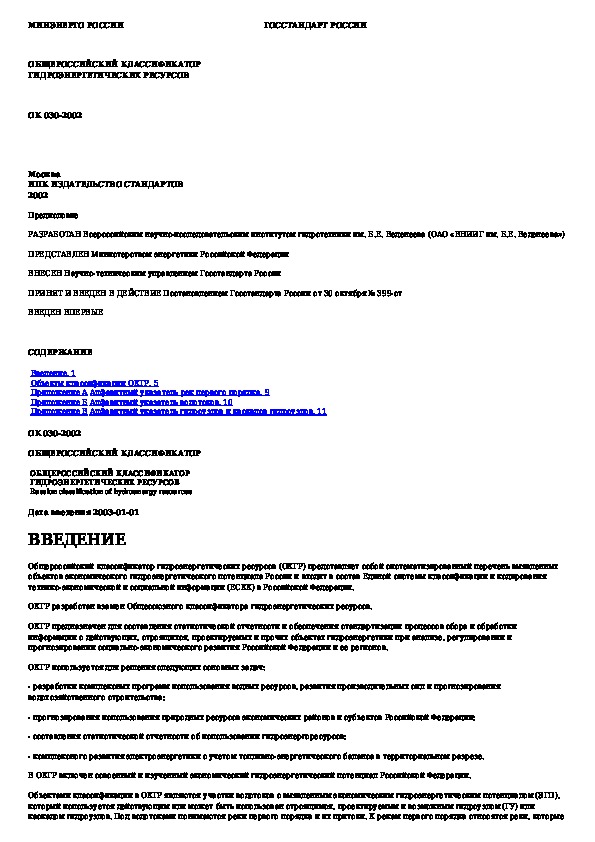 ОК 030-2002: Общероссийский классификатор гидроэнергетических ресурсов