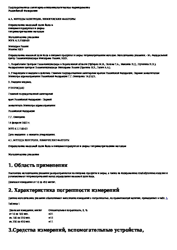 МУК 4.1.1106-02: Определение массовой доли йода в пищевых продуктах и сырье титриметрическим методом