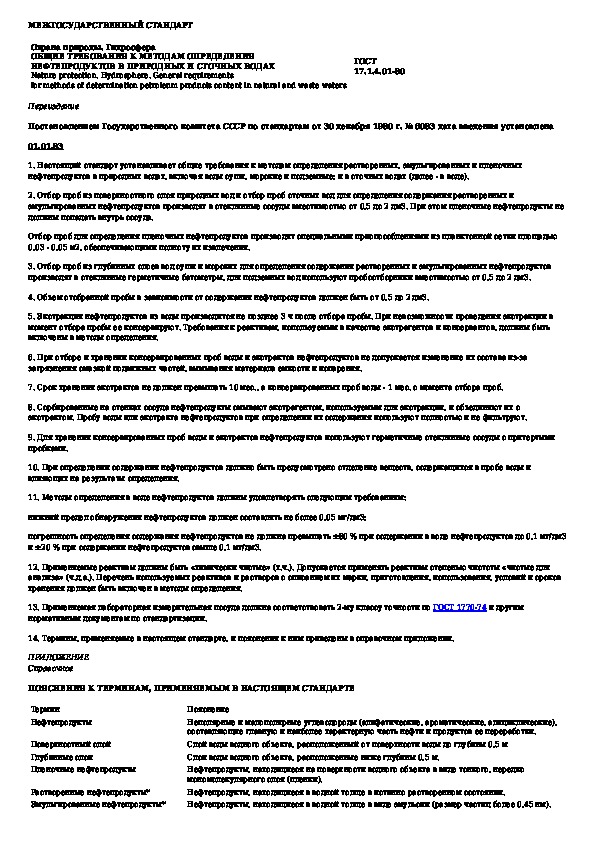 ГОСТ 17.1.4.01-80: Охрана природы. Гидросфера. Общие требования к методам определения нефтепродуктов в природных и сточных водах