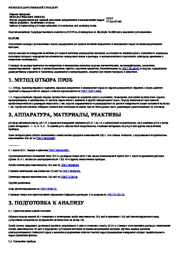 ГОСТ 17.5.4.01-84: Охрана природы. Рекультивация земель. Метод определения pH водной вытяжки вскрышных и вмещающих пород