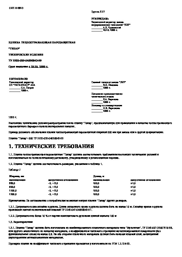 ТУ 2255-059-04696843-99: Пленка теплоотражающая парозащитная "ТЕПАР". Технические условия