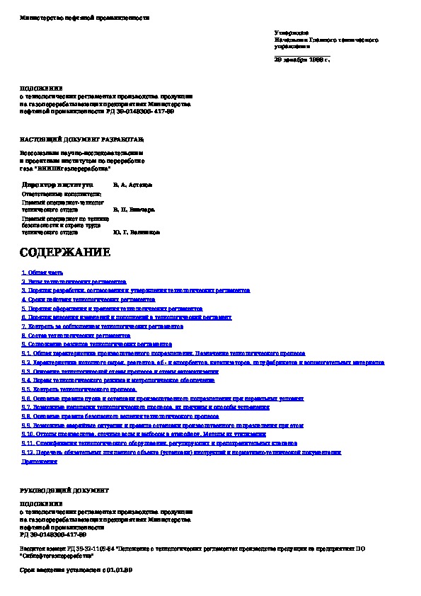 Положение о технологических регламентах производства продукции на газоперерабатывающих предприятиях Министерства нефтяной про