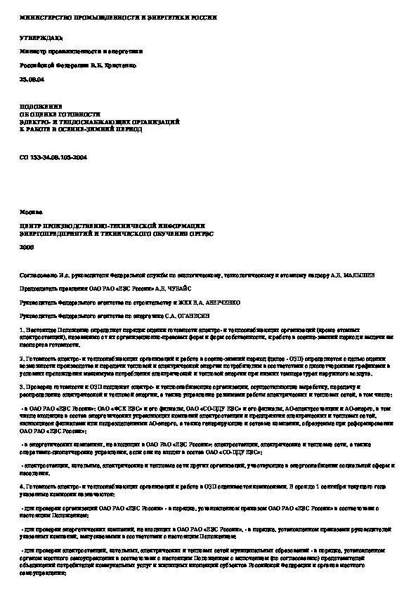 СО 153-34.08.105-2004: Положение об оценке готовности электро- и теплоснабжающих организаций к работе в осенне-зимний период