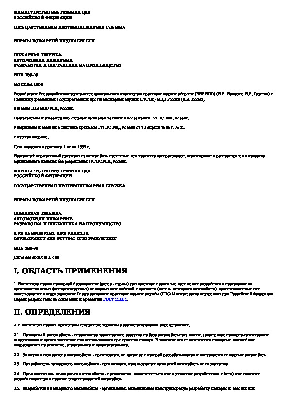 НПБ 180-99: Пожарная техника. Автомобили пожарные. Разработка и постановка на производство