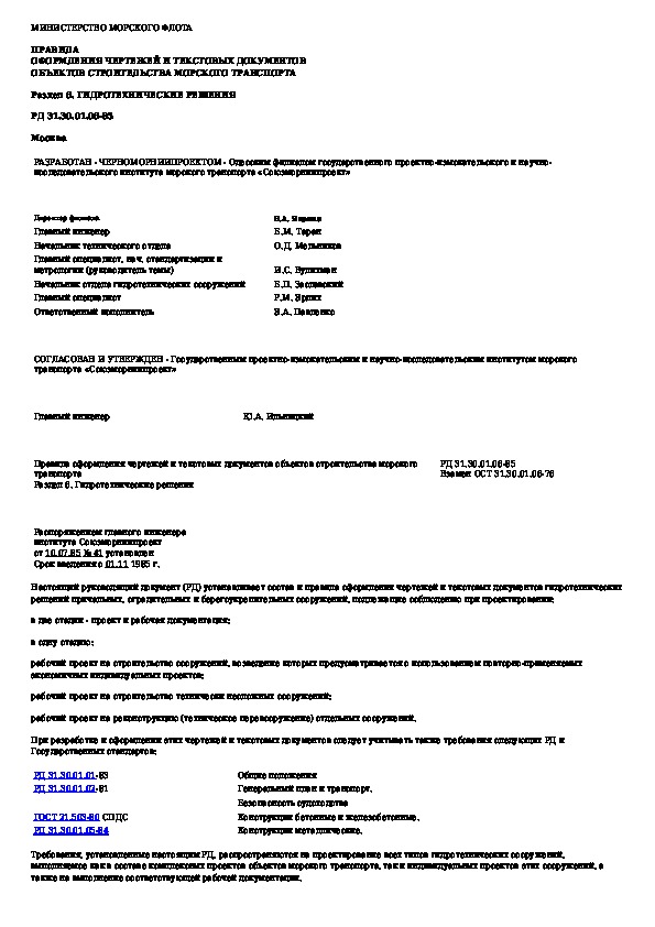 РД 31.30.01.06-85: Правила оформления чертежей и текстовых документов объектов морского транспорта. Раздел 6. Гидротехнические решения
