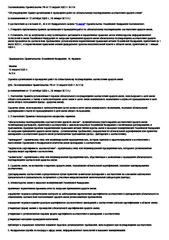 Правила организации и проведения работ по обязательному подтверждению соответствия средств связи