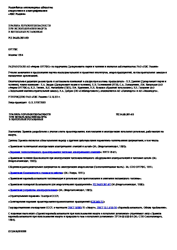 РД 34.03.351-93: Правила взрывобезопасности при использовании мазута в котельных установках