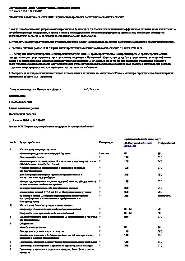 Раздел ТСН "Нормы водопотребления населения Московской области"