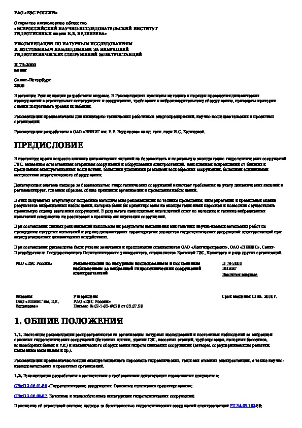 П 73-2000: Рекомендации по натурным исследованиям и постоянным наблюдениям за вибрацией гидротехнических сооружений электростанций
