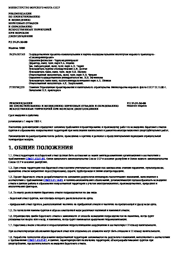 РД 31.31.50-88: Рекомендации по проектированию и возведению береговых отвалов и образованию искусственных территорий при морском дноуглублении