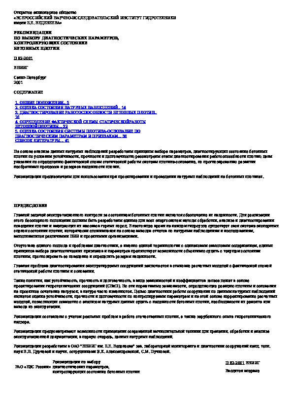 П 82-2001: Рекомендации по выбору диагностических параметров, контролирующих состояние бетонных плотин