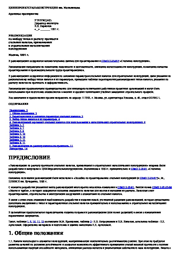 Наша цель состоит в том, чтобы предоставить вам быстрый доступ к содержанию документа Рекомендации по выбору типов и расчету прочности стальных канатов, применяемых в строительных металлических конструкциях.