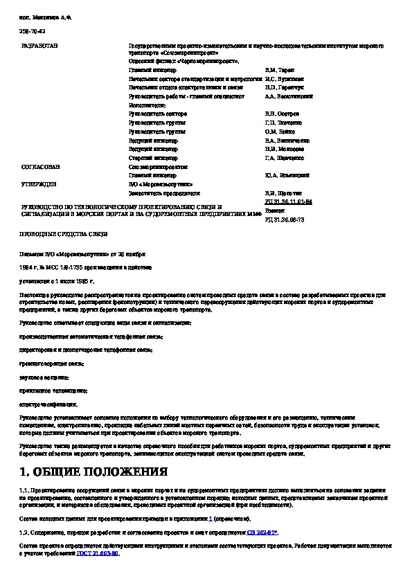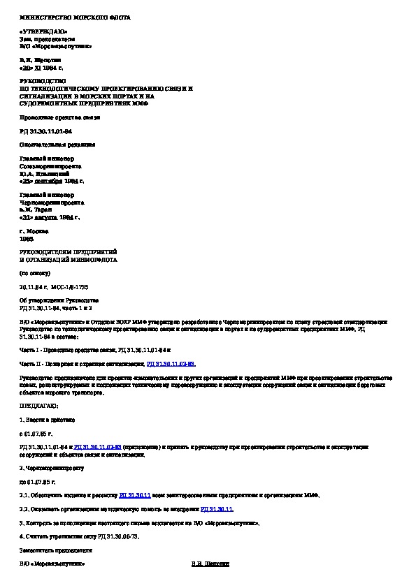 РД 31.30.11.01-84: Руководство по технологическому проектированию связи и сигнализации в морских портах и на судоремонтных предприятиях ММФ. Провод
