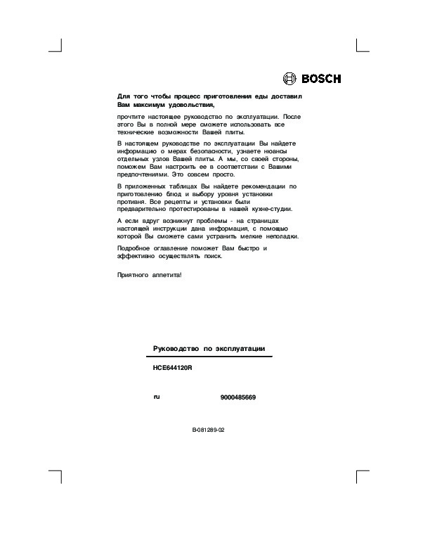Наша цель состоит в том, чтобы предоставить вам быстрый доступ к содержанию инструкции для плиты Bosch HCE644120R. С помощью онлайн просмотра, Вы можете быстро просмотреть содержимое инструкции и найти решение проблемы с плиты Bosch HCE644120R.