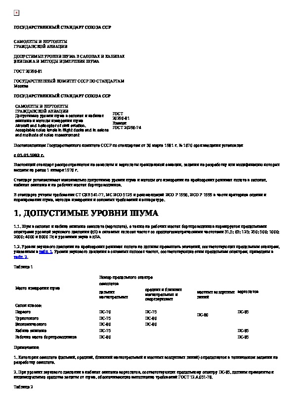 ГОСТ 20296-81: Самолеты и вертолеты гражданской авиации. Допустимые уровни шума в салонах и кабинах экипажа и методы измерения шума