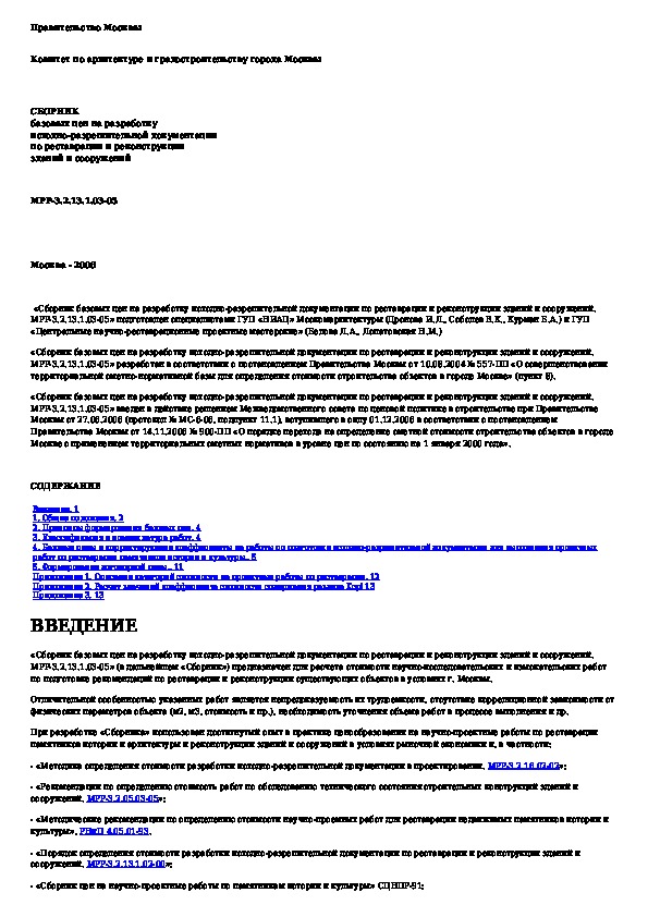 Наша цель состоит в том, чтобы предоставить вам быстрый доступ к содержанию документа Сборник базовых цен на разработку исходно-разрешительной документации по реставрации и реконструкции зданий и сооружений.