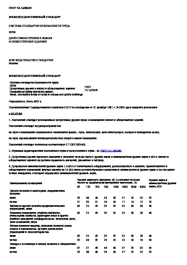 Система стандартов безопасности труда. Шум. Допустимые уровни в жилых и общественных зданиях