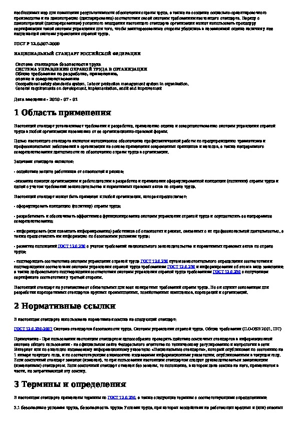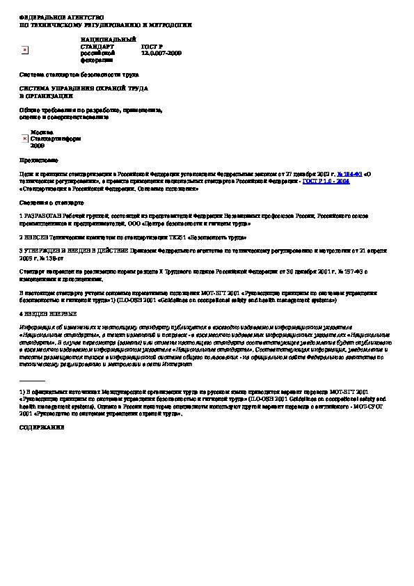 ГОСТ Р 12.0.007-2009: Система стандартов безопасности труда. Система управления охраной труда в организации. Общие требования по разработке, применени