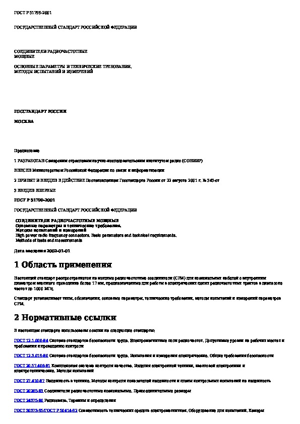 ГОСТ Р 51799-2001: Соединители радиочастотные мощные. Основные параметры и технические требования. Методы испытаний и измерений