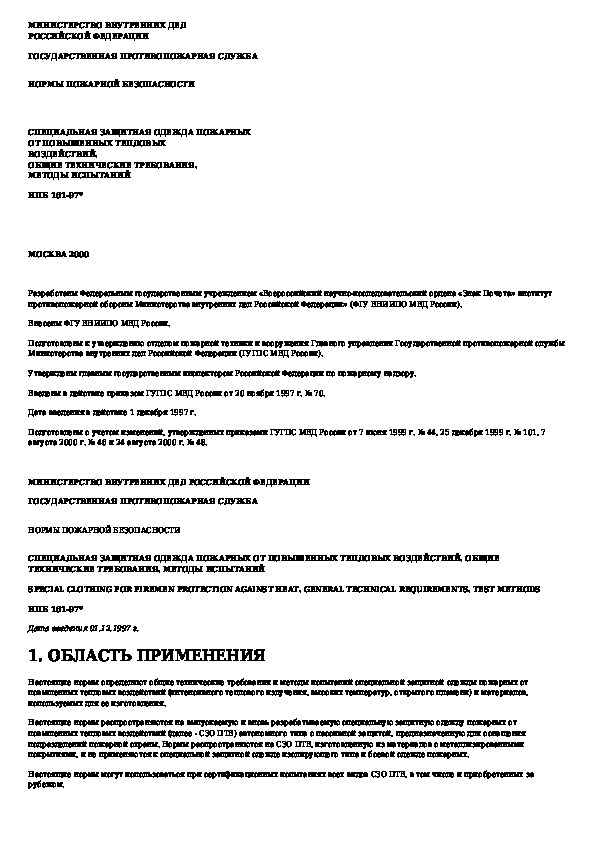 НПБ 161-97*: Специальная защитная одежда пожарных от повышенных тепловых воздействий. Общие технические требования. Методы испытаний