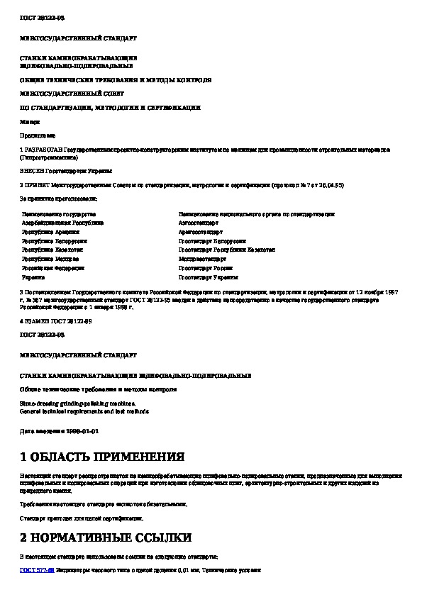 ГОСТ 28122-95: Станки камнеобрабатывающие шлифовально-полировальные. Общие технические требования и методы контроля
