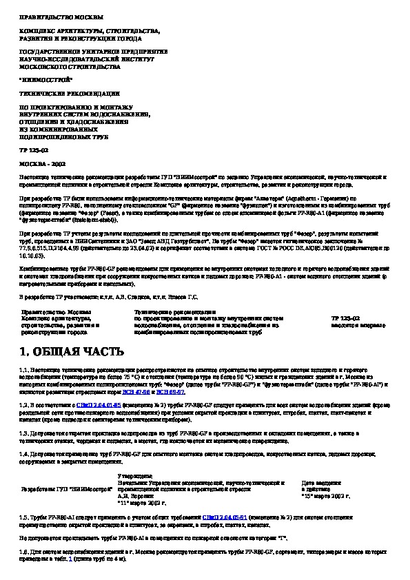 ТР 125-02: Технические рекомендации по проектированию и монтажу внутренних систем водоснабжения, отопления и хладоснабжения из комбинирова