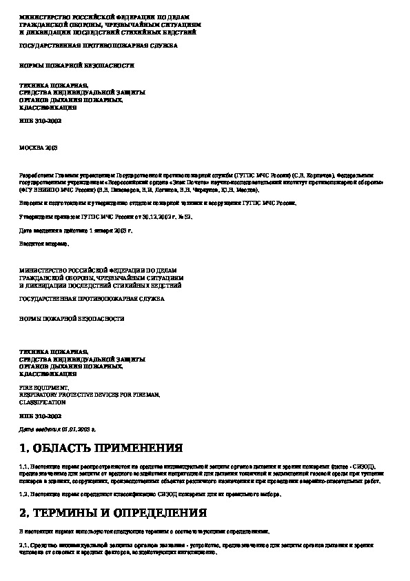 НПБ 310-2002: Техника пожарная. Средства индивидуальной защиты органов дыхания пожарных. Классификация