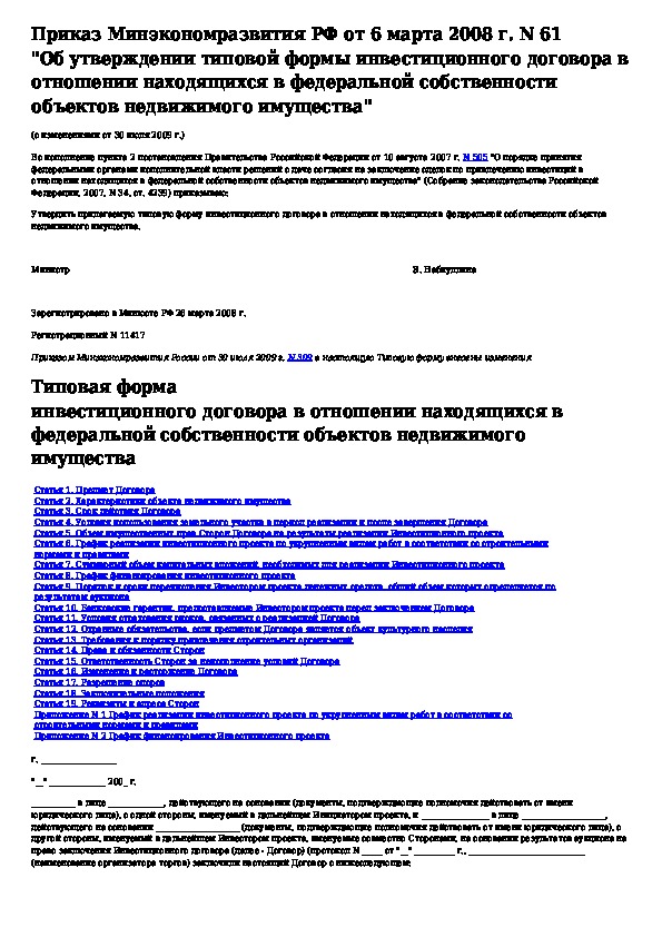 Наша цель состоит в том, чтобы предоставить вам быстрый доступ к содержанию документа Типовая форма инвестиционного договора в отношении находящихся в федеральной собственности объектов недвижимого имущества.