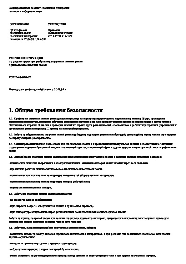 Наша цель состоит в том, чтобы предоставить вам быстрый доступ к содержанию документа Типовая инструкция по охране труда при работах на стоечных линиях связи при подвеске кабелей связи.