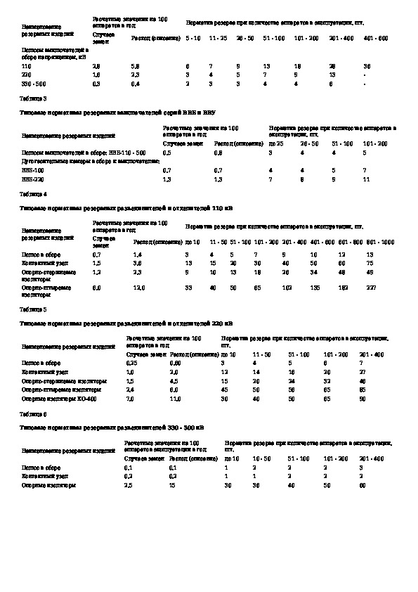 Типовые нормативы резервной коммутационной аппаратуры 110 - 500 кВ для подстанций и РУ электростанций