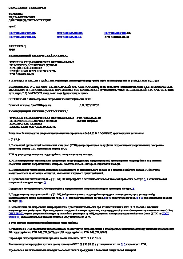 РТМ 108.023.20-83: Турбины гидравлические вертикальные поворотно-лопастные осевые и радиально-осевые. Предельная металлоемкость