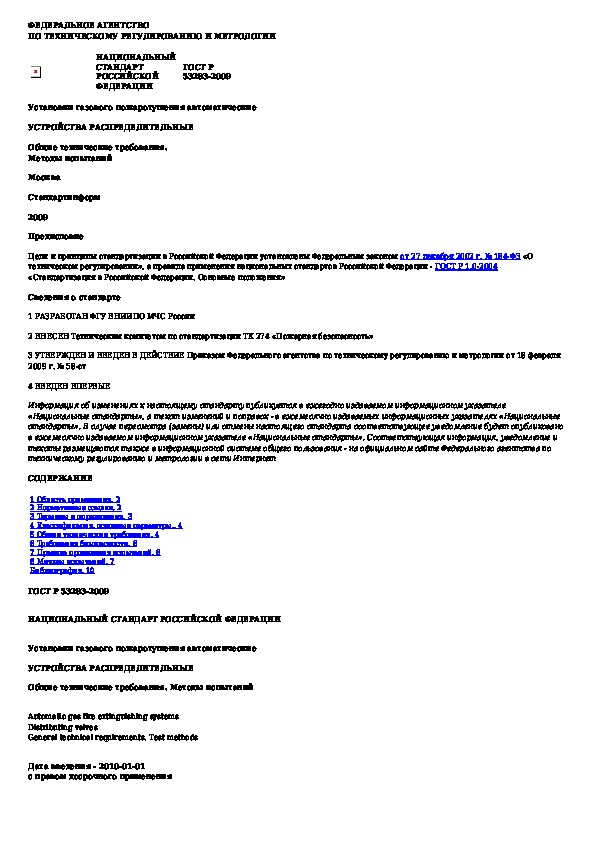 ГОСТ Р 53283-2009: Установки газового пожаротушения автоматические. Устройства распределительные. Общие технические требования. Методы испытаний