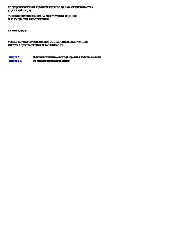 Наша цель состоит в том, чтобы предоставить вам быстрый доступ к содержанию документа Узлы и детали трубопроводов из пластмассовых труб для систем водоснабжения и канализации.