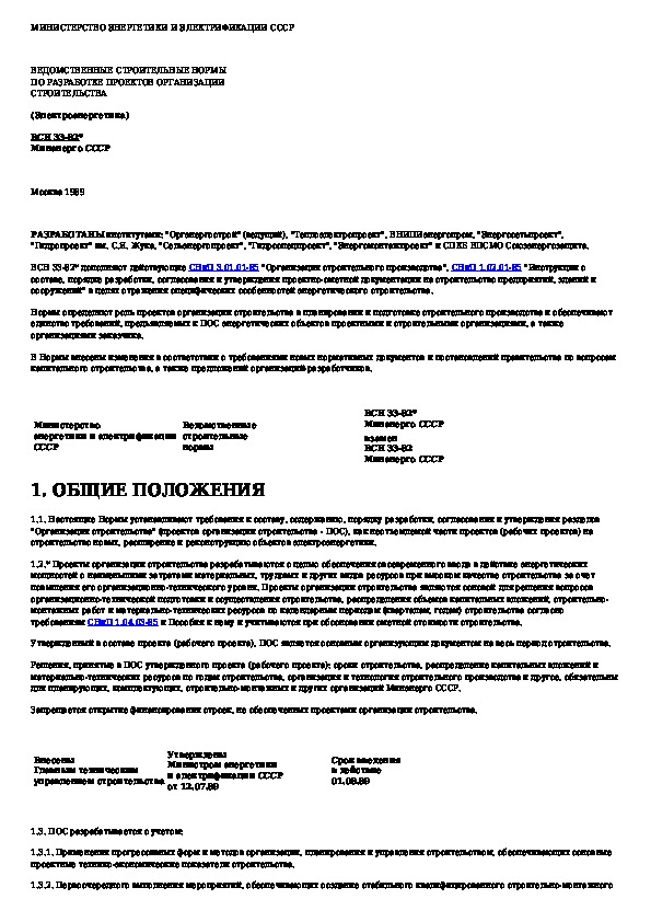 ВСН 33-82*: Ведомственные строительные нормы по разработке проектов организации строительства (Электроэнергетика)
