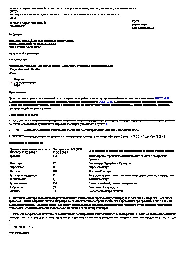 Наша цель состоит в том, чтобы предоставить вам быстрый доступ к содержанию документа Вибрация. Лабораторный метод оценки вибрации, передаваемой через сиденье оператора машины. Напольный транспорт.