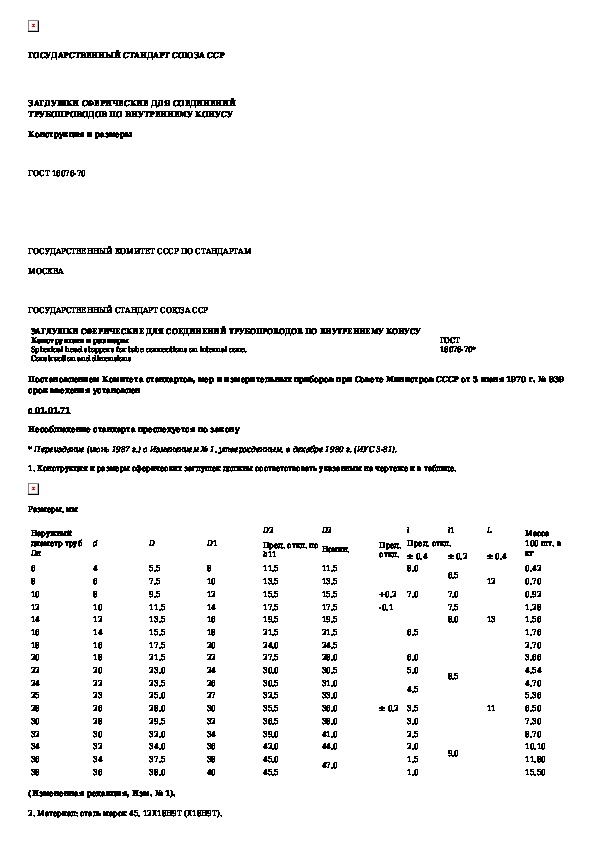 ГОСТ 16076-70: Заглушки сферические для соединений трубопроводов по внутреннему конусу. Конструкция и размеры